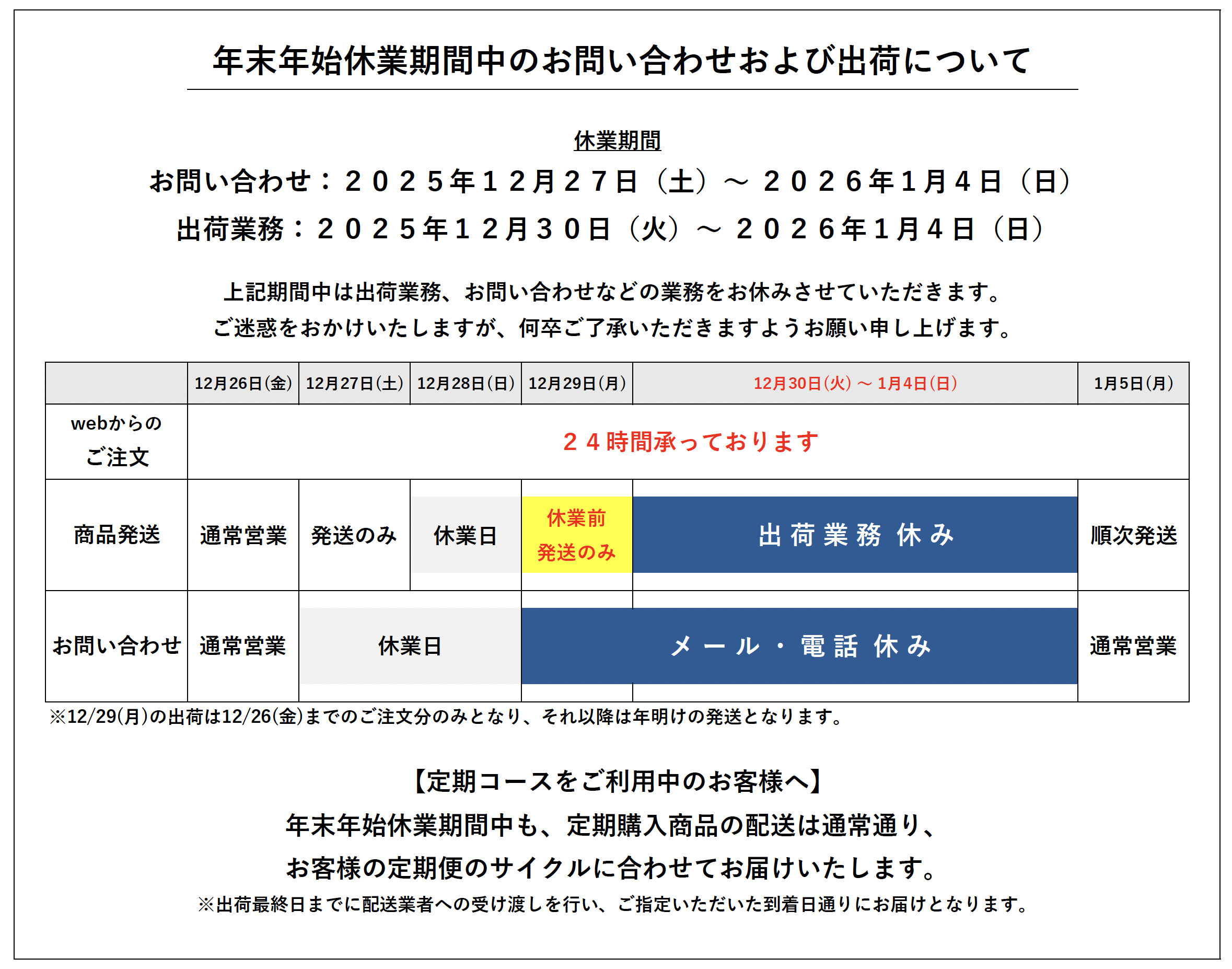 なお、定期コースをご利用中のお客様は、年末年始休業期間中も、定期購入商品の配送は通常通り、お客様の定期便のサイクルに合わせてお届けいたします。